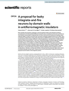 A proposal for leaky integrate-and-fire neurons by domain walls in antiferromagnetic insulators.