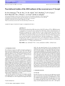 We present near-infrared (near-IR) observations of the 2010 outburst of U Sco. JHK photometry is presented on 10 consecutive days starting from 0.59 d after outburst. Such photometry can gainfully be integrated into a larger data base of other multiwavelength data which aim to comprehensively study the evolution of U Sco. Early near-IR spectra, starting from 0.56 d after outburst, are presented and their general characteristics discussed. Early in the eruption, we see very broad wings in several spectral lines, with tails extending up to ∼10 000 km s−1 along the line of sight; it is unexpected to have a nova with ejection velocities equal to those usually thought to be exclusive to supernovae. From recombination analysis, we estimate an upper limit of [inline image] for the ejected mass.