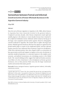 Since the start of Korean migration to Argentina in the 1960s, ethnic Koreans in Argentina have been intensively involved in the garment industry. Compared to previous decades, when Korean entrepreneurs made rapid and notable progress in the industry, in recent decades Koreans have remained in the semiformal Avellaneda Avenue wholesale market instead of moving up to the larger, more competitive formal market segment. Based on ethnographic research conducted in Argentina, this research aims to explore why large-scale Korean wholesale garment businesses that have the capacity to expand into the formal market prefer to remain in the semiformal market, and how informal business practices have influenced these businesses’ long-term development. While these informal practices have been shaped within an environment of loose government control and rampant corruption in the sector, the decision to maintain semiformal operations is a contextual response to the complex social, economic, and political circumstances of a developing country in the Global South. The research findings further suggest that informal business practices seem likely to be the critical factor in the development of Korean garment businesses, even as these practices block entry into the larger mainstream market and constrain their future growth.