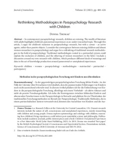 In contemporary parapsychology research, children are missing. The wealth of literature with adults highlights children’s paranormal experiences as an under-researched topic. Through this article, I argue for children’s inclusion in parapsychology research, but with a caveat – as active agents, rather than passive objects. I consider the convergences between missing children and absent women researchers in parapsychology and argue for a rethinking of traditional research methodologies in the field of parapsychology. Traditional methodologies rooted in a patriarchal system could explain the exclusion of children, and the othering of women researchers in the field. I include a discussion around my own research with children, which produces different kinds of meanings and data in the act of knowledge production around paranormal or unexplained experiences.