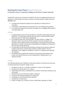 This is the fourth phase of Rewriting the Future, a project funded by FutureU. The overarching aim is to understand specific barriers and enablers to continued educational engagement towards higher education, for marginalised groups. This report considers adult learners aged 20 plus, returning to education to study at level 3 and on access to higher education courses. The research was undertaken in 2022. Adult learners have historically been an underrepresented group in government policy. The focus has been on Widening Participation (WP) students in general. WP students are often described as ‘non-traditional’ students, including students from disadvantaged backgrounds, part-time undergraduate students, first-generation students, ethnic minority students, refugees and asylum seekers, students from low-income backgrounds, care-leavers, vocational and work-based learners and disabled learners, who may also be mature learners. Previously available research suggests that lack of confidence and standard qualification routes may be barriers even though adult learners bring many transferable skills to education and yet the predominant focus in policy has been to prioritise the financial support essential for WP students to participate in post-compulsory education. Rewriting the Future focuses instead on multi-contextual barriers and enablers to engagement.