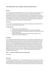 Eating disorders are broadly defined as the control of food and eating patterns to cope with extreme feelings and thoughts, and they can have significant physical, psychological and social effects on people’s lives. This article aims to raise nurses’ awareness of various eating disorders, how they are experienced and evidence-based approaches to their treatment. It considers eating disorders across the life span and outlines how to screen and assess for these conditions. The authors use case studies to describe the use of therapeutic interventions and treatment plans in inpatient and community care, thereby supporting informed nursing practice.