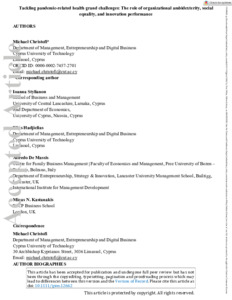Tackling pandemic‐related health grand challenges: The role of organizational ambidexterity, social equality, and innovation performance.