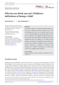 We asked 92 children in North West England, aged 2–17, if they were children and what it meant to be a child. Our findings show that not all children think they are a ‘child’. Although different age groups defined ‘childness’ in different ways, children reproduced normative Western discourses of childhood, including ideas which subordinate them. The children in our study seemed unable to articulate their capabilities and contributions. We argue that children and adults need to co‐produce positive definitions of childness to facilitate adult acceptance of children's participation in society and continue the struggle against adultism.