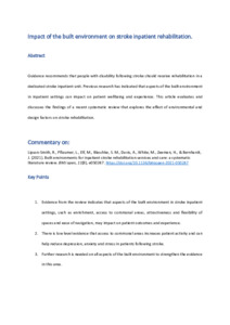 Guidance recommends that people with disability following stroke should receive rehabilitation in a dedicated stroke inpatient unit. Previous research has indicated that aspects of the built environment in inpatient settings can impact on patient wellbeing and experience. This article evaluates and discusses the findings of a recent systematic review that explores the effect of environmental and design factors on stroke rehabilitation.