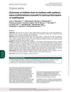 Reynolds, John A, Gayed, Mary, Khamashta, Munther A, Leone, Francesca, Toescu, Veronica, Bruce, Ian N, Giles, Ian, Teh, Lee-Suan, McHugh, Neil et al (2022) Outcomes of children born to mothers with systemic lupus erythematosus exposed to hydroxychloroquine or azathioprine. Rheumatology, 62 (3). pp. 1124-1135. ISSN 1462-0332