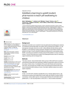 Background: Appropriate medication use is essential in ensuring optimal pharmacotherapeutic outcomes. It is mistakenly assumed that adults can swallow solid oral dosage forms (SODFs, e.g. tablets/capsules colloquially referred to as ‘pills’), without difficulty and that children cannot. KidzMed is a ‘pill swallowing’ training programme designed to teach effective SODF use in patients of all ages. It may be utilised by healthcare professionals to assist patients taking SODFs. E-learning was essential for training during COVID pandemic to reduce viral transmission. The aim of this study was to explore UK student pharmacists views of e-learning to support swallowing solid oral dosage forms. Methods: This study used pre- and post-intervention online surveys on Microsoft Forms to evaluate self-directed eLearning about pill swallowing on MPharm programmes at three UK Universities using a 13-item survey. A combination of five-point Likert Scales and free-text items were used. The eLearning was available via the virtual learning environment at the University and embedded within existing curriculum. Descriptive statistical analysis was used to explore responses. Results: In total, 113 of 340 (33%) students completed the survey. Seventy-eight percent (n = 65) reported the eLearning would enable them to teach adults and children to swallow SODFs successfully. Learners either agreed or strongly agreed that they felt comfortable to teach patients (95%, n = 62/113) and parents or carers (94%, n = 60) to swallow medications having completed the e-learning. Student pharmacists generally found eLearning as an acceptable way to reflect on their own experiences of ‘pill’ swallowing and how to support patients to swallow SODFs. Conclusion: The KidzMed eLearning was well received by student pharmacists. Further work is needed to explore whether skills translates into real life application in the clinical settings.