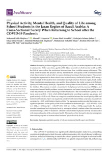 Mahfouz, Mohamed Salih, Alqassim, Ahmad Y, Sobaikhi, Nasser Hadi, Jathmi, Abdulaziz Salman, Alsadi, Fahad Omar, Alqahtani, Abdullah Mohammed, Mohalhil, Mohammed, Sabi, Ibrahim Darwish, Wafi, Ahmed M et al (2023) Physical Activity, Mental Health, and Quality of Life among School Students in the Jazan Region of Saudi Arabia: A Cross-Sectional Survey When Returning to School after the COVID-19 Pandemic. Healthcare, 11 (7).