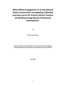 Grinyer, Victoria (2021) What Affects Engagement in an Educational Online Community? Investigating a Blended Learning Course for Primary School Teachers Undertaking Postgraduate Professional Development. Doctoral thesis, University of Central Lancashire.