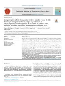 Salehpour, Saghar, Hosseini, Sedighe, Razghandi, Zahra, Hosseinirad, Hossein and Ziaee, Hasti (2023) Comparing the effect of sequential embryo transfer versus double blastocyst embryo transfer on pregnancy outcomes in intracytoplasmic sperm injection (ICSI) cycles in patients with repeated implantation failure: A randomized controlled trial. Taiwanese Journal of Obstetrics & Gynecology, 62 (2). pp. 264-269. ISSN 1028-4559