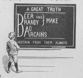 This image, from the Band of Hope Review in 1906, shows the use of initial letters for word play, which would both entertain the young viewer and act as a help to memorising the slogan.