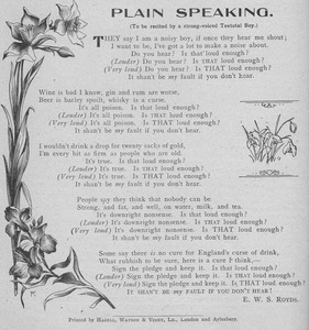 This recitation, to be performed at concerts or parties, offers a loud-voiced boy an opportunity to enjoy himself shouting, as well as passing on the temperance message. It shows how much humour was sometimes mixed in with the temperance message. Recitations provided opportunities for children to participate in events, but also gave them confidence and trained their memory. Some were serious, but others were lively and must have been fun to perform, such as this one from the Band of Hope Review in 1902