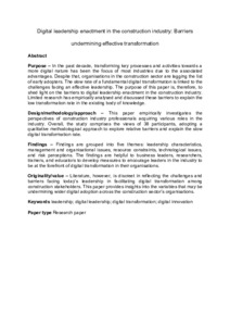 In the past decade, transforming key processes and activities towards a more digital nature has been the focus of most industries due to the associated advantages. Despite that, organisations in the construction sector are lagging the list of early adopters. The slow rate of a fundamental digital transformation is linked to the challenges facing an effective leadership. The purpose of this paper is, therefore, to shed light on the barriers to digital leadership enactment in the construction industry. Limited research has empirically analysed and discussed these barriers to explain the low transformation rate in the existing body of knowledge.