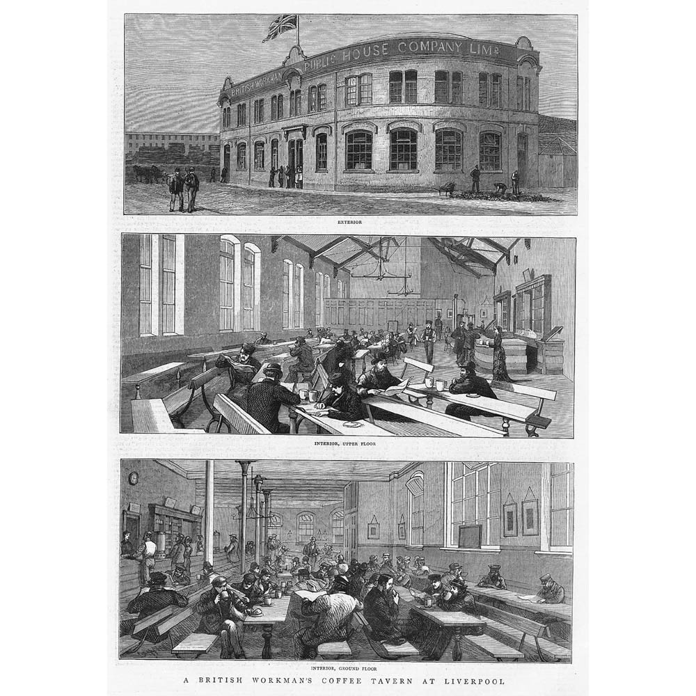 Alternatives to the pub, with a variety of names such as coffee palaces, cocoa rooms, and even public houses, existed in almost every town in the country by the end of the nineteenth century. Here, a coffee tavern sponsored by the British Workman temperance magazine in Liverpool is shown in 1878, one of many.