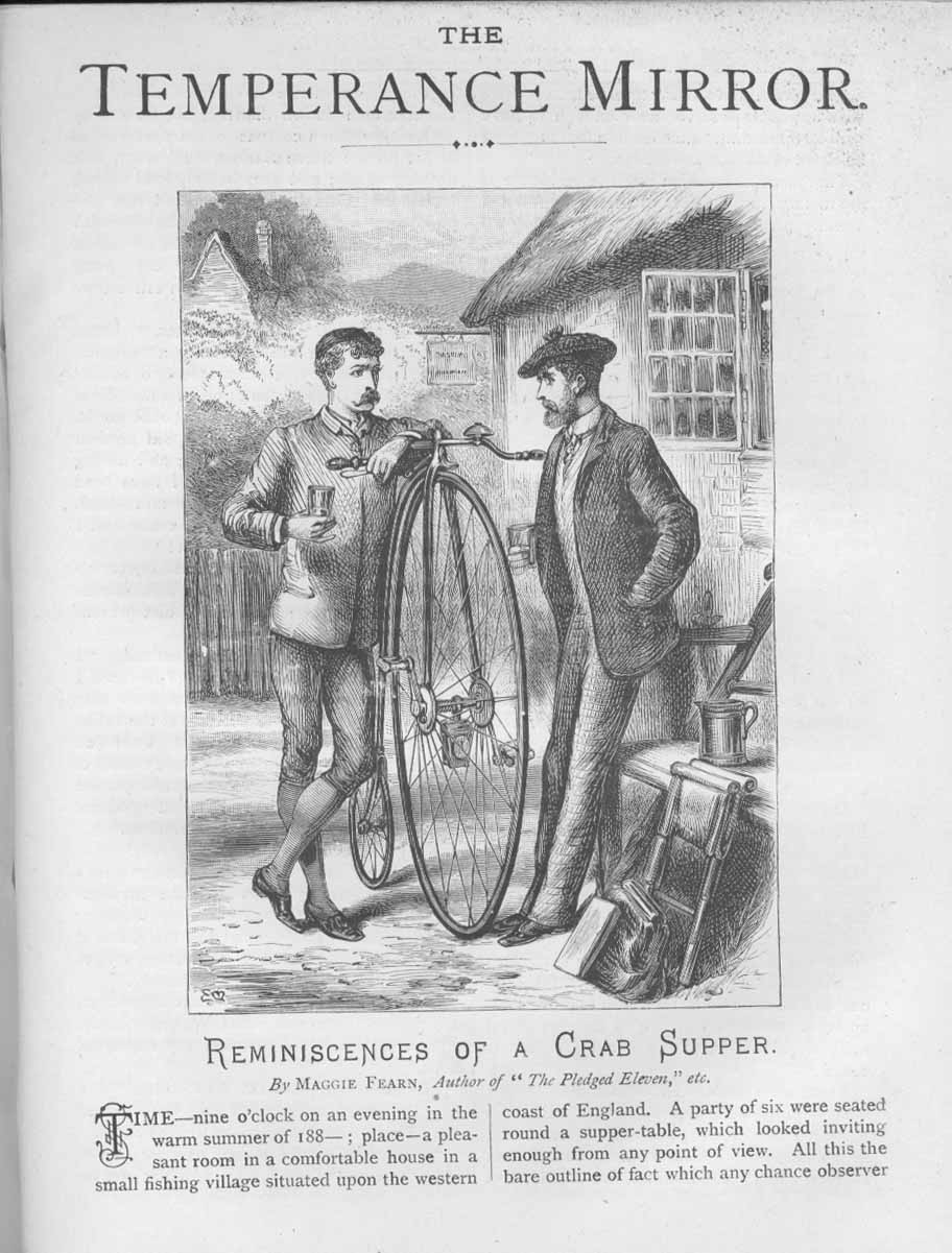 The two men here, from a story in The Temperance Mirror, 1887, are shown leading a healthy life: they are exercising by cycling, they are enjoying a glass of water, and are looking forward to a crab supper after the day’s endeavours.