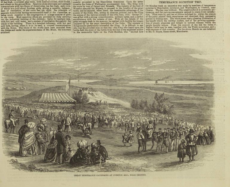 On Monday week an excursion was made by members of temperance societies in Manchester, Liverpool and Warrington, to Overton, near Chester. The day was brilliant. The neighbourhood is extremely picturesque and the various amusements seemed to create lively satisfaction. Fires were lit, and tea ... indulged in ; whilst the orators of the party related their ... their persuasive powers to willing ears. The whole scene was a pleasing illustration of the benefit which the railway offers and of the growing appreciation of simple pleasure and delight in natural scenery which the people happily evince. From the summit of the hill the ruins of Halton Castle may be seen, together with the Welsh mountains, and a wide expanse of rich country. For the above sketch we are indebted to Mr. O. Hayes, Essex street, Manchester.