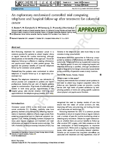 An exploratory randomised controlled trial comparing telephone and hospital follow-up after treatment for colorectal cancer.