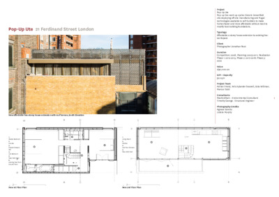 Pop-up live-work prototype house that up-cycles historic brownfield site deploying off-site manufacturing and frugal DfMA assembly jig technologies available to self-builders to make homes faster and more affordable without need to modify host building foundations. Completed in 2022.