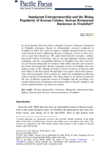Kim, Jihye orcid iconORCID: 0000-0002-4254-7114 (2023) Immigrant Entrepreneurship and the Rising Popularity of Korean Cuisine: Korean Restaurant Businesses in Frankfurt. Pacific Focus, 38 (2). pp. 288-313. ISSN 1225-4657