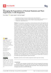 The management of expectations in doctoral education relates to the negotiation and agreement of a learning contract denoting actions and initiatives between a student and a supervisor. A learning contract is a set of understandings of what things, actions and initiatives might reasonably be expected from whom, in the course of learning, where there is a natural power imbalance. This is important so that both scholarly and material progress can be made along all points of the doctoral learning experience, i.e., that learning is personalised, professional and productive towards an original contribution of knowledge. It is the evidencing of this continual learning process through research that is deemed to be doctoral at the final examination stage. A doctoral student is a learner on the highest degree pathway that is available at all UK universities. This typically results in a thesis, marking the end point of being supervised whereupon an assessment or examination takes place, which, in UK universities, is called a viva voce (Latin: the living voice). This is a verbal account or defence of the thesis document by the student, made to two or three examiners who comprise the examination team. In the UK, the viva examination is a private event, while elsewhere, for example, across Europe and North America, the examination can be a public event. A student on a doctoral programme usually has a period of registration that is 3 years full-time or 6 years part-time. Other terms that can be used interchangeably around doctoral supervision are candidate (for the student) and candidature, which is their period of registration. Supervisors also have roles denoted as the Director of Studies (DoS) or Principal Investigator (PI). The supervision team is led by a Director of Studies (or PI) who is often the most experienced scholar who teaches, guides and mentors their student’s learning through the research they conduct. There are usually at least two supervisors in a supervision team in the UK, but there can be more as required depending upon the specialisms and topics being researched. Expectations formed by either the student or the supervisor(s) can be about physical resources to embark upon a passage of learning through a doctoral programme, or more typically, the discussion of expectations relates to managing the behaviours of students and supervisors in their respective roles. Managed expectations help to achieve a balance between the intellectual sharing of expertise by the supervisor with the self-directed initiatives for learning, which are taken by the student. The aim of managing expectations is to help a student move from dependence in their learning at the start of their programme to becoming an independent doctoral-level scholar who, once graduated as doctor, can act autonomously to conduct their own research, or even embark upon supervising others’ research in the future.