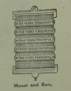 This diagram from the UK Band of Hope trading catalogue shows the ‘Holdfast’ system of bars for each year of attendance, up to seven years. A real example is shown elsewhere in this section.