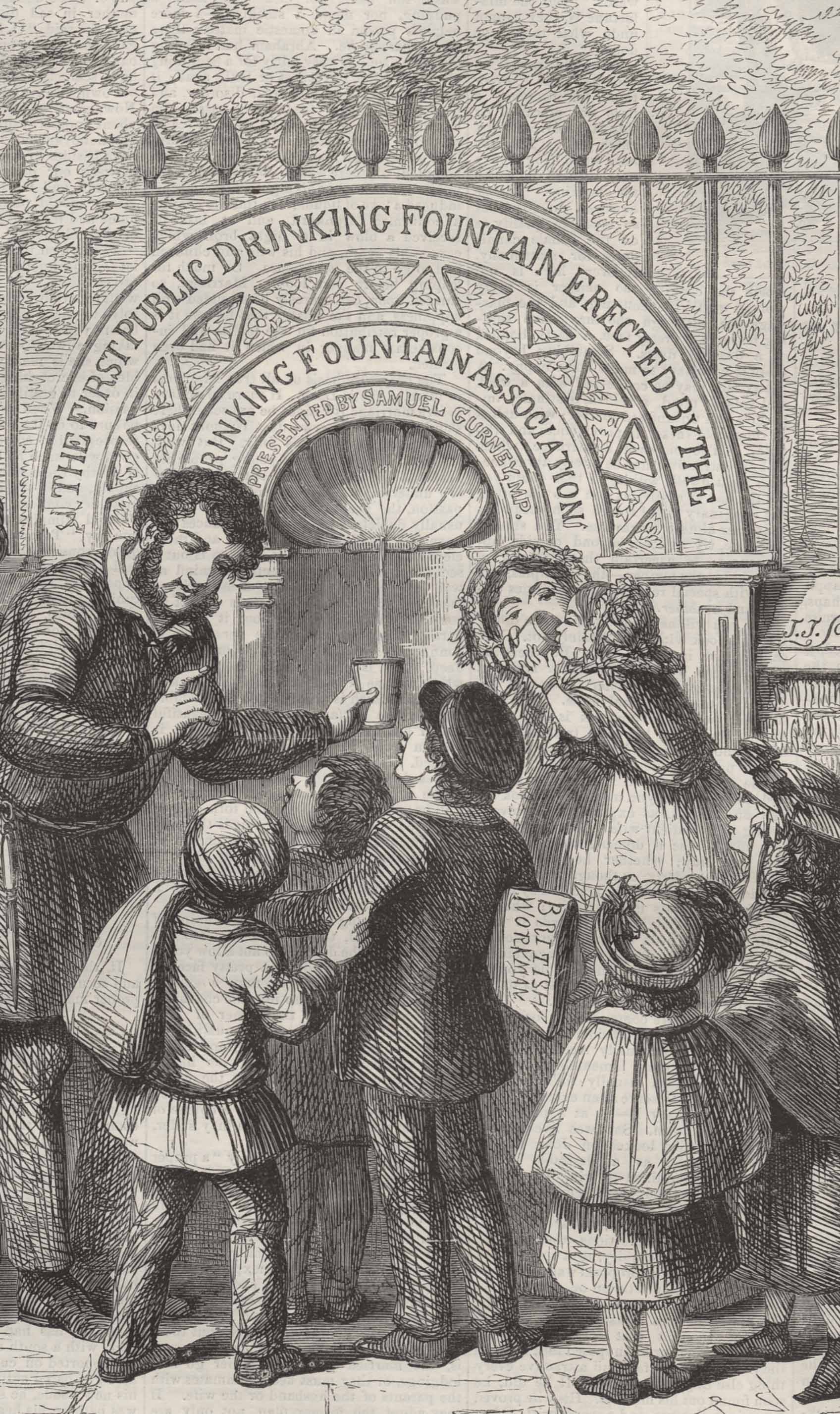Water was frequently used as a symbol in songs and poems, and many illustrations featured it, too. This image from the British Workman shows adults helping and instructing children, at a drinking fountain.