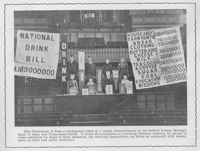 This illustration is from a photograph taken at a recent Demonstration of the Salford County Borough Band of Hope and Temperance Union. It forms the conclusion of a striking tableaux by means of cubes exhibited by Band of Hope members, the National Expenditure on Drink as compared with money spent in other and useful directions.