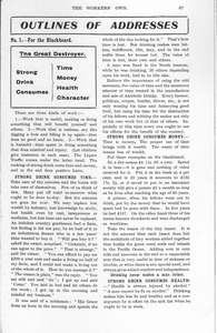 Enforce the importance of using the odd moments, the value of time and the enormous amount of time wasted in the manufacture and sale of Alcoholic Drinks. Every brewer, publican, cooper, bottler, driver, etc., is not only wasting his time for the destruction of his fellows and robbing the nation not only of his own work but that of others. Especially at this time every one ought to use his efforts for the benefit of the country.