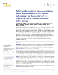 Public preferences for using quantitative faecal immunochemical test versus colonoscopy as diagnostic test for colorectal cancer: evidence from an online survey.