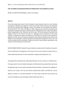 This article details what former French President François Hollande refers to as the ‘brutality and injustice’ afflicted on the Algerians at the hands of the French in the past, and examines how this has impacted their language, culture, and identity into the present day (cited in Pecastaing 2013). The French took Algeria in 1830 using genocide and ethnic cleansing under the guise of civilising those they considered inferior. Although they left in 1962 when Algeria gained independence, their influence can still be seen. The article explores the positive and negative impact of the removal of Arabic as a language and the revolution of the family complex. It examines the status and behaviour of the Pieds noirs (workers who migrated to Algeria from other areas of Europe and were given citizenship) and explores who seems to be entitled to be considered a national sensation (winning sports people) and who is not. The article concludes that the treatment of Algerians may be at least partially responsible for the creation of some extremists and terrorists.