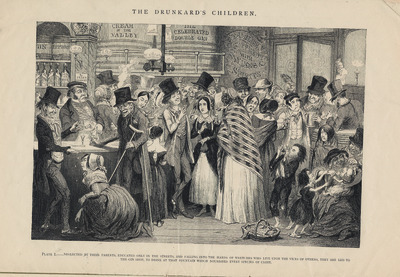 PLATE I. – Neglected by their parents, education only in the streets, and falling into he hands of wretches who live upon the vices of others, they are led to the gin shop, to drink at that fountain which nourishes every species of crime.