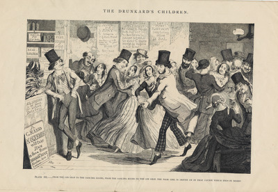 PLATE III. – From the gin shop to the dancing rooms, from the dancing rooms to the gin shop, the poor girl is driven on in that course which ends in misery.