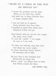 This is a piece by Sir Wilfred Lawson which has its tongue firmly in its cheek. The seemingly joyful nature of the passage highlights the influence of the drinks industry over the state. The powerful illustration shows the reality of the drunkard child and the ironic quote from the poem ‘Oh joy! That in this Christian land Should fall my happy fate.