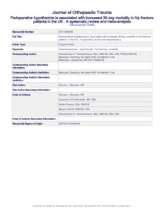 Mroczek, Thomas J., Prodromidis, Apostolos D., Pearce, Adrian, Malik, Rayaz A. and Charalambous, Charalambos P (2022) Perioperative Hypothermia Is Associated With Increased 30-Day Mortality in Hip Fracture Patients in the United Kingdom: Α Systematic Review and Meta-analysis. Journal of Orthopaedic Trauma, 36 (7). pp. 343-348. ISSN 0890-5339
