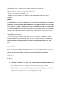 In older adults living with diabetes, there is a higher prevalence of frailty and a greater risk of cognitive impairment. Cognitive frailty is defined by the presence of both and is associated with an increased risk of mortality. A systematic review was undertaken to estimate the prevalence of cognitive frailty in community-dwelling older adults living with diabetes and associated risk factors. This commentary critically appraises the review and explores the implications of the findings for community practice.
