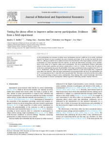 As low participation and retention in online survey participation decrease confidence in its results, traditional research has focused on ways to optimize the survey structure and design. So far, no study has tested the decoy effect (i.e. offering an inferior decoy option to increase the attractiveness of the target option) to increase survey participation. In a field experiment with 203 students, we tested the effectiveness of adding a decoy questionnaire to the choice set to improve online survey participation. The decoy questionnaire featured open-ended instead of close-ended questions and delayed remuneration (1 week vs. 4 weeks). We found that the presence of the decoy questionnaire increased the probability of the target questionnaire being completed from 32.7 % to 55.9 %. Furthermore, while the decoy did not affect response behavior or cause non-response bias, a significant order effect was observed. When the target questionnaire was presented before the decoy, the participation was 82.7 % in comparison to 28.0 % when the decoy was presented first. This study is the first to test the decoy effect in the context of aiming to improve survey participation. These findings offer a ‘proof of principle’ that decoys have the potential to increase participation without negatively influencing question response behavior.