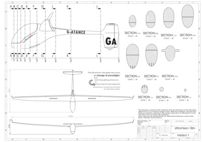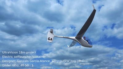 Renders of the UltraVision glider 18m with flaps, designed by Gonzalo Garcia-Atance with an estimated glide ratio of 46-50:1. Intended to be developed with an electric sustainer/selflauncher.