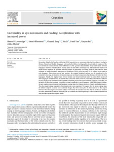 Liversedge, Simon Paul orcid iconORCID: 0000-0002-8579-8546, Olkoniemi, Henri, Zang, Chuanli orcid iconORCID: 0000-0002-9573-4968, Li, Xin, Yan, Guoli, Bai, Xuejun and Hyönä, Jukka (2024) Universality in eye movements and reading: A replication with increased power. Cognition, 242 . ISSN 0010-0277