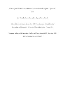 Steene, Lisa Maria beethoven, Gaylor, Lisa and Ireland, Jane Louise orcid iconORCID: 0000-0002-5117-5930 (2023) Risk and protective factors for self-harm in secure mental health hospitals: a systematic review. Journal of aggression conflict and peace . ISSN 1759-6599