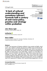 Wainwright, John Peter orcid iconORCID: 0000-0002-8190-0144, Burke, Lol and Collett, Steve (2024) ‘A lack of cultural understanding and sometimes interest’: Towards half a century of anti-racist policy, practice and strategy within probation. Probation Journal, 71 (2). ISSN 0264-5505