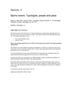 Moreover there is a deficiency of information concerning particular event types such as those associated with smaller events, along with those connected to parades and festivals. Therefore the aims of this chapter are twofold: first to introduce and evaluate current sport event typologies, and second to present an argument for sports events to be treated separately because of their