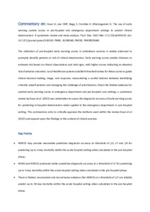 The use of prehospital early warning scores in ambulance services is widely endorsed to promptly identify patients at risk of clinical deterioration. Early warning scores enable clinicians to estimate risk based on clinical observations and vital signs, with higher scores indicating an elevated risk of adverse outcomes. Local healthcare systems establish threshold values for these scores to guide clinical decision-making, triage, and response, necessitating a careful balance between identifying critically unwell patients and managing the challenge of prioritisation. Given the limited evidence for optimal early warning scores in emergency department and prehospital care settings, a systematic review was carried out by Guan et al (2022) to assess the diagnostic accuracy of early warning scores for predicting in-hospital deterioration when applied in the emergency department or prehospital setting. This commentary aims to critically appraise the methods used within the review by Guan et al (2022) and expand upon the findings in the context of clinical practice.