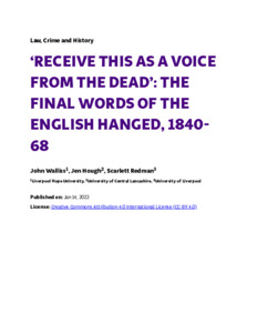 Walliss, John, Hough, Jennifer orcid iconORCID: 0000-0002-6206-0522 and Redman, Scarlett (2022) ‘RECEIVE THIS AS A VOICE FROM THE DEAD’: THE FINAL WORDS OF THE ENGLISH HANGED, 1840-68. Law, Crime and History .