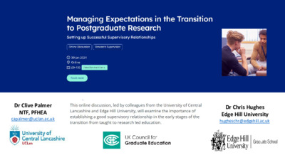 In: Managing Expectations in the Transition to Postgraduate Research: Setting up Successful Supervisory Relationships, 30 Jan 2024, Online.