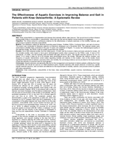 Conclusion: Aquatic exercises are generally effective for the management and treatment of elderly patients suffering from knee osteoarthritis and should be used as an initial treatment option. Aquatic exercises with proper protocols of warm-up, specific aquatic exercise sessions, and cool-down are effective for the improvement of mobility, balance, and postural control in patients with knee osteoarthritis.