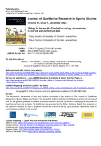For the scout, the heady responsibility for recognising footballing talent in young players is melded with the promise of their potential success, or even greatness in the game. However, implicit of the scout’s role and duty, once talent is spotted, is to pass that talent on to others to nurture, for example, by coaching staff at clubs or academies. This common obligation in scouts for ‘letting go’ characterisestheir existence, often in want of recognition for their claims-to-fame, for success stemming from their wisdom and insight to the game. Therefore, ironically, a scout’s actions seem to be underwritten by a sense of loss, apart from the brief claim that ‘I discovered genius’. This paper reveals aspects of this vicarious lived experience by means of data presented in story and song, collected through a phenomenological lens. The stage is set first by an exposition of the scout’s magical [under]world and working conditions, followed by a methodological synthesis of the phenomenon itself, scouting, with relevant theory. Then the story: Taking in a game: a glimpse through the lens of a Nowhere Man is followed immediately by the song: 40p a Mile and a Sausage Roll. These refined presentations of data invite the reader onto the terraces alongside the researcher, and then to participate in the reflection of ‘being there’, as a researcher engaged in ‘scout-ology’. In conclusion, the paper highlights how from the moment of the highly prized discovery the scout seems committed to live in the shadows, understood only by their own community, to continue their vigil, constantly scoping for talent on the football horizon, for glimmers of hope.