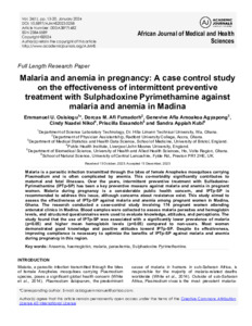 Osisiogu, Emmanuel U., Afi Fumadorh, Dorcas M., Agyapong, Genevive Afia Amoakoa, Nikoi, Cindy Naadei, Essandoh, Priscilla and Appiah Kubi, Sandra (2024) Malaria and anemia in pregnancy: A case control study on the effectiveness of intermittent preventive treatment with Sulphadoxine Pyrimethamine against malaria and anemia in Madina. African Journal of Medical and Health Sciences, 24 (1). pp. 13-20. ISSN 2384-5589