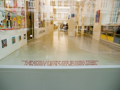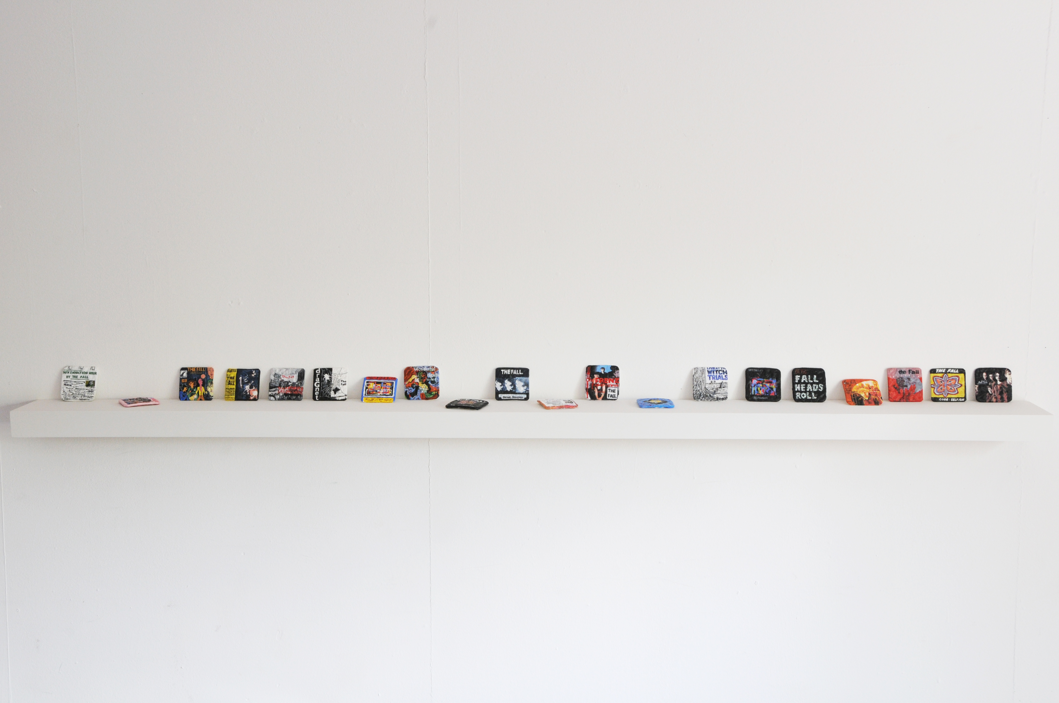 The exhibition ‘Paintwork 3; Pop Musik und Kunst’ included two new collaborative works by David Alker and Peter Liddell. These were ‘The Fall Album League 2008’ (2009), a series of 20 paintings representing miniature album covers, and ‘EVIDENTLY CHICKEN TOWN’ (2009) a text work displayed in the window of the gallery.