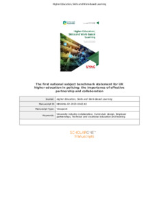 Pepper, Ian, Cox, Carol, Fee, Ruth, Horgan, Shane, Jarman, Rod, Jones, Matthew, Policek, Nicoletta, Rogers, Colin and Tattum, Clive (2024) The first national subject benchmark statement for UK higher education in policing: the importance of effective partnership and collaboration. Higher Education, Skills and Work-Based Learning, 14 (5). ISSN 2042-3896