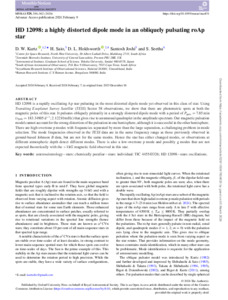 Kurtz, Donald Wayne orcid iconORCID: 0000-0002-1015-3268, Saio, H, Holdsworth, Daniel Luke orcid iconORCID: 0000-0003-2002-896X, Joshi, Santosh and Seetha, S (2024) HD 12098: a highly distorted dipole mode in an obliquely pulsating roAp star. Monthly Notices of the Royal Astronomical Society, 529 (1). pp. 556-562. ISSN 0035-8711